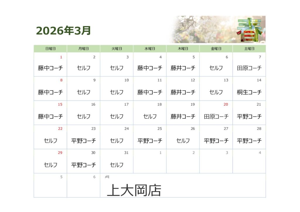 3月上大岡店シフト表