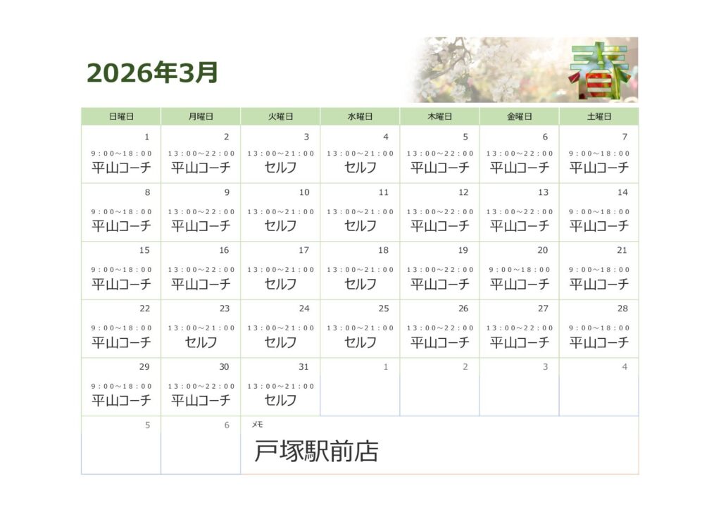 3月戸塚駅前店シフト表