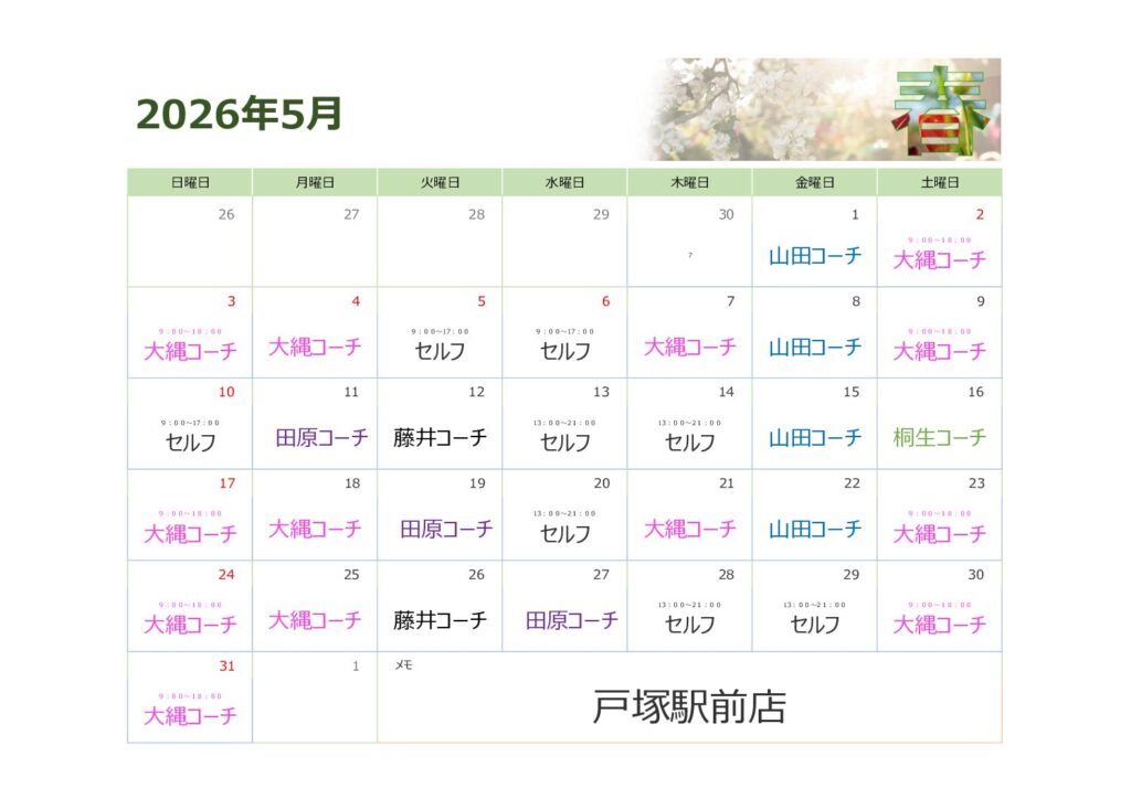 5月戸塚駅前店シフト表